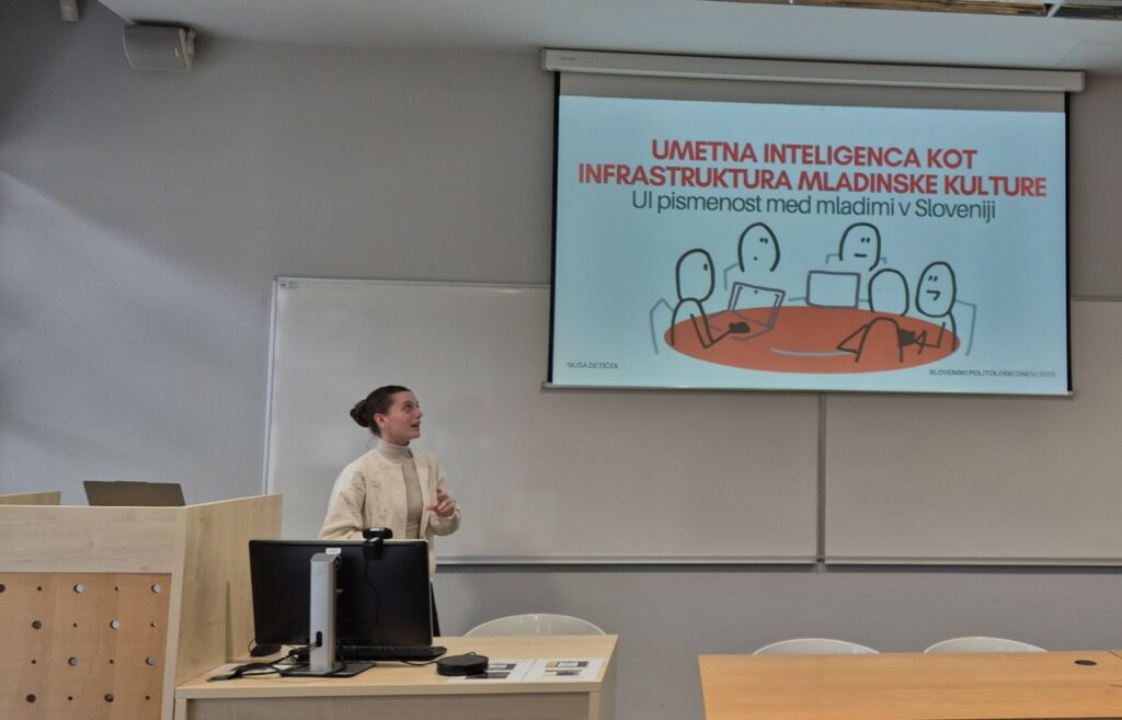 Na Fakulteti za družbene vede UL se je 9. decembra odvil že tradicionalni Slovenski politološki dan, ki ga organizira Slovensko politološko društvo. Ena izmed osrednjih tem konference, ki je letos nosila naslov Politična oblast, odpor in (ne)zmožnost zavezništev, je bilo tudi vprašanje o protislovjih današnjega časa. Na panelu Družboslovna implikacija orodij umetne inteligence je Nuša Detiček predstavila kombinacijo kvantitativnih in kvalitativnih rezultatov projekta Digitalna zrelost mladih, ki se vežejo na (upo)rabo in stališča mladih do orodji umetne inteligence (klepetalniki generativne UI). Predstavitev je bila konceptualno postavljena v infrastrukturni model sodobne družbenosti, s katerim je bilo prikazano, da za mlade generativna UI ni zgolj orodje, temveč postaja infrastruktura njihovega vsakdanjega delovanja.