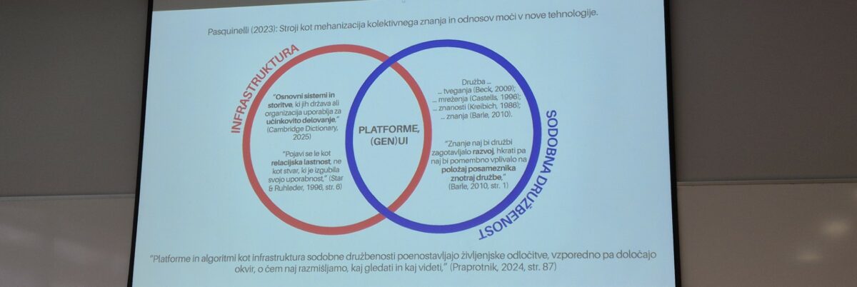Na Fakulteti za družbene vede UL se je 9. decembra odvil že tradicionalni Slovenski politološki dan, ki ga organizira Slovensko politološko društvo. Ena izmed osrednjih tem konference, ki je letos nosila naslov Politična oblast, odpor in (ne)zmožnost zavezništev, je bilo tudi vprašanje o protislovjih današnjega časa. Na panelu Družboslovna implikacija orodij umetne inteligence je Nuša Detiček predstavila kombinacijo kvantitativnih in kvalitativnih rezultatov projekta Digitalna zrelost mladih, ki se vežejo na (upo)rabo in stališča mladih do orodji umetne inteligence (klepetalniki generativne UI). Predstavitev je bila konceptualno postavljena v infrastrukturni model sodobne družbenosti, s katerim je bilo prikazano, da za mlade generativna UI ni zgolj orodje, temveč postaja infrastruktura njihovega vsakdanjega delovanja.