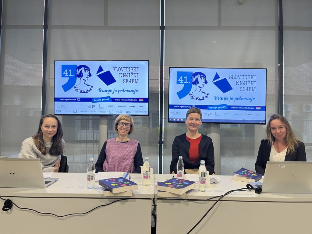 Urška Henigman, Ana Vogrinčič Čepič, Katja Koren Ošljak in Tanja Oblak Črnič na odru Založniške akademije na 41. knjižnem sejmu.